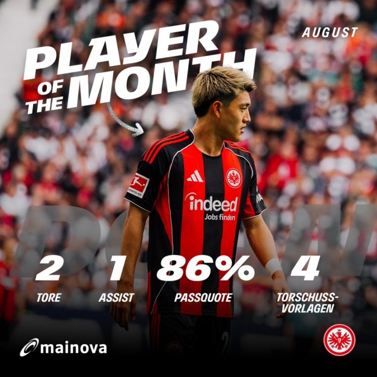 8月份堂安律共为法兰克福出战3场正式比赛,打入4球助攻1次,法兰克福官方表示凭借在德甲第2轮球队3-1击败霍芬海姆的比赛2射1传的表现,堂安律当选8月最佳。